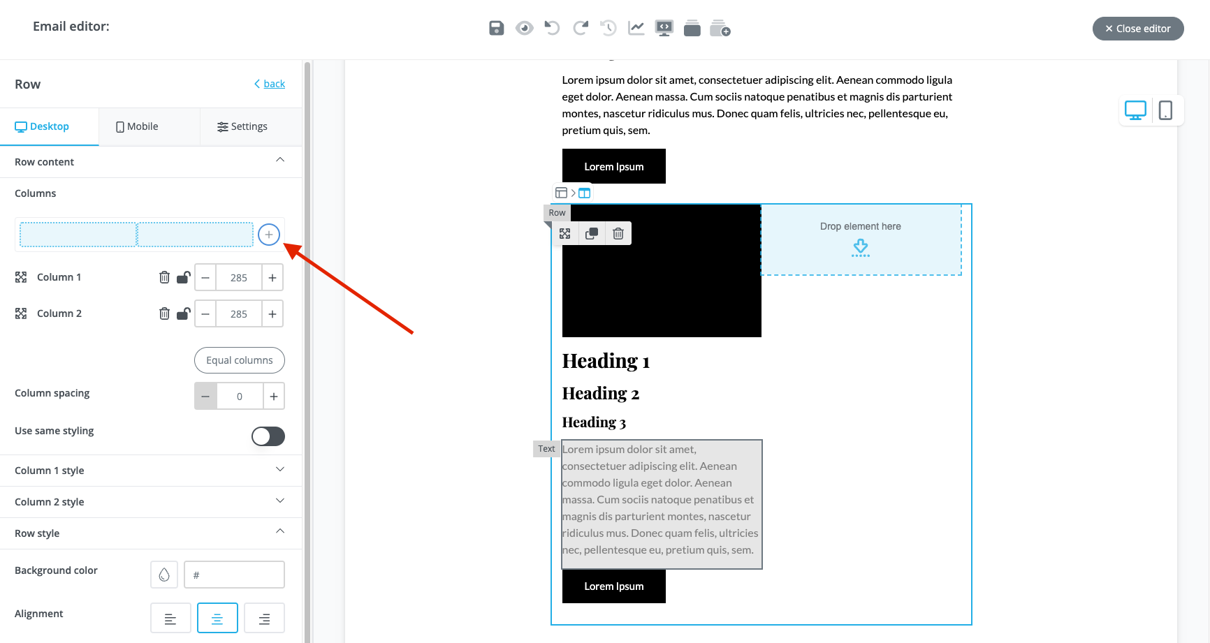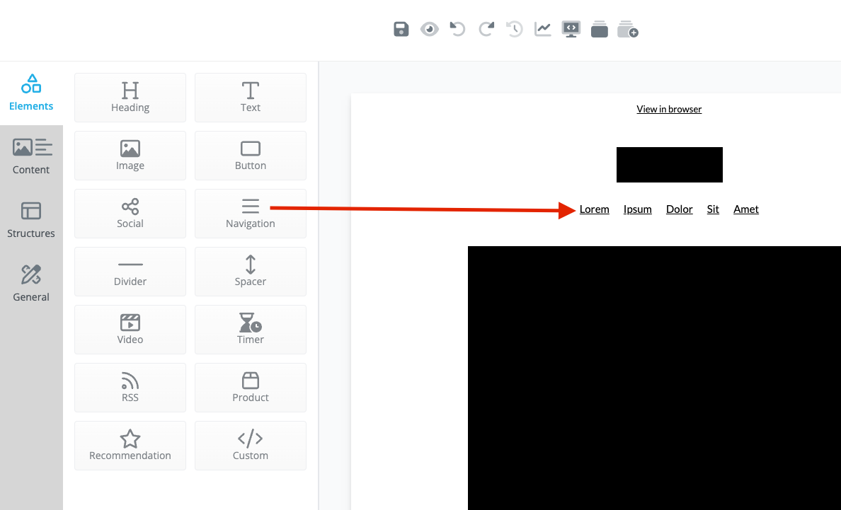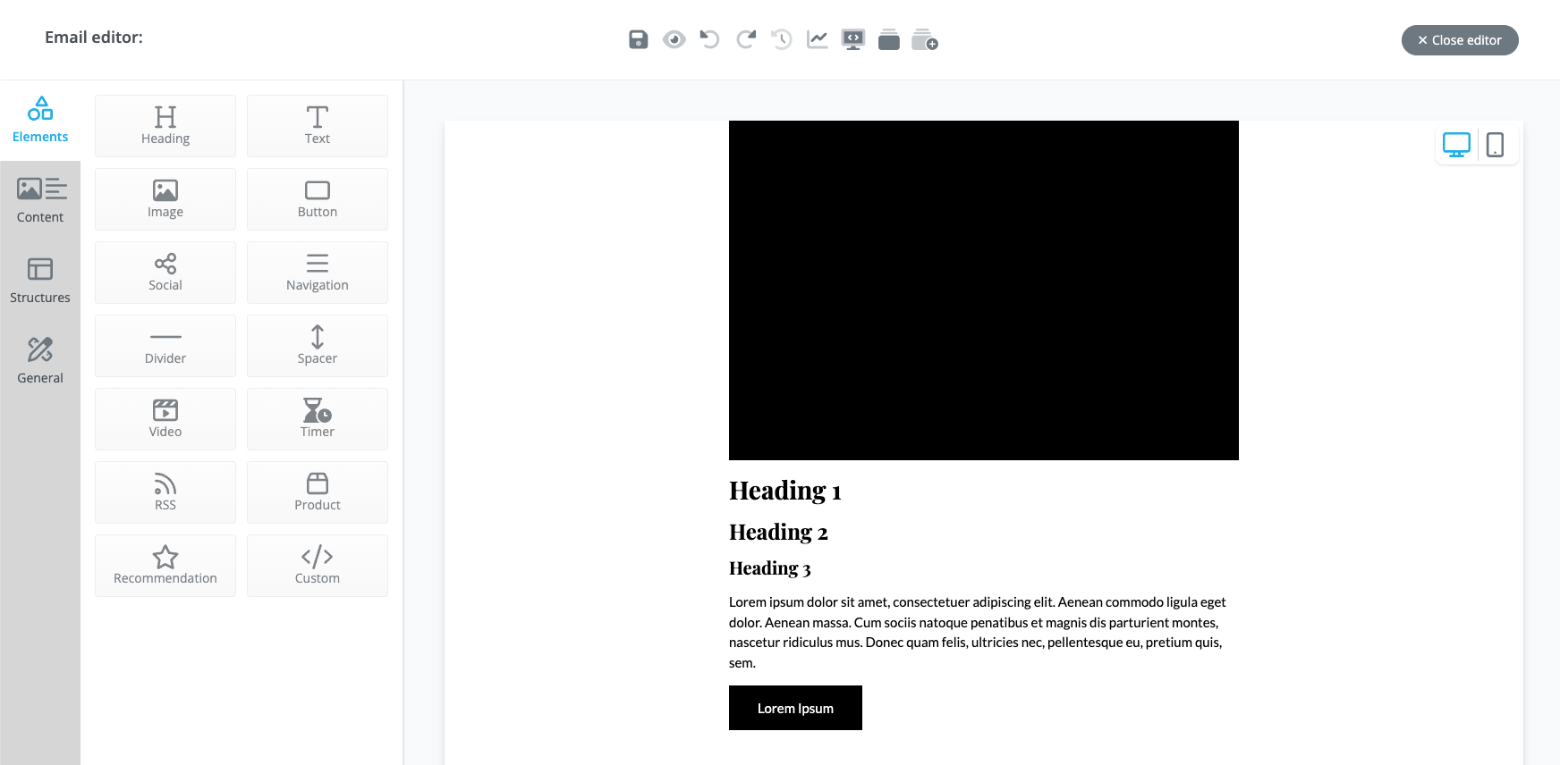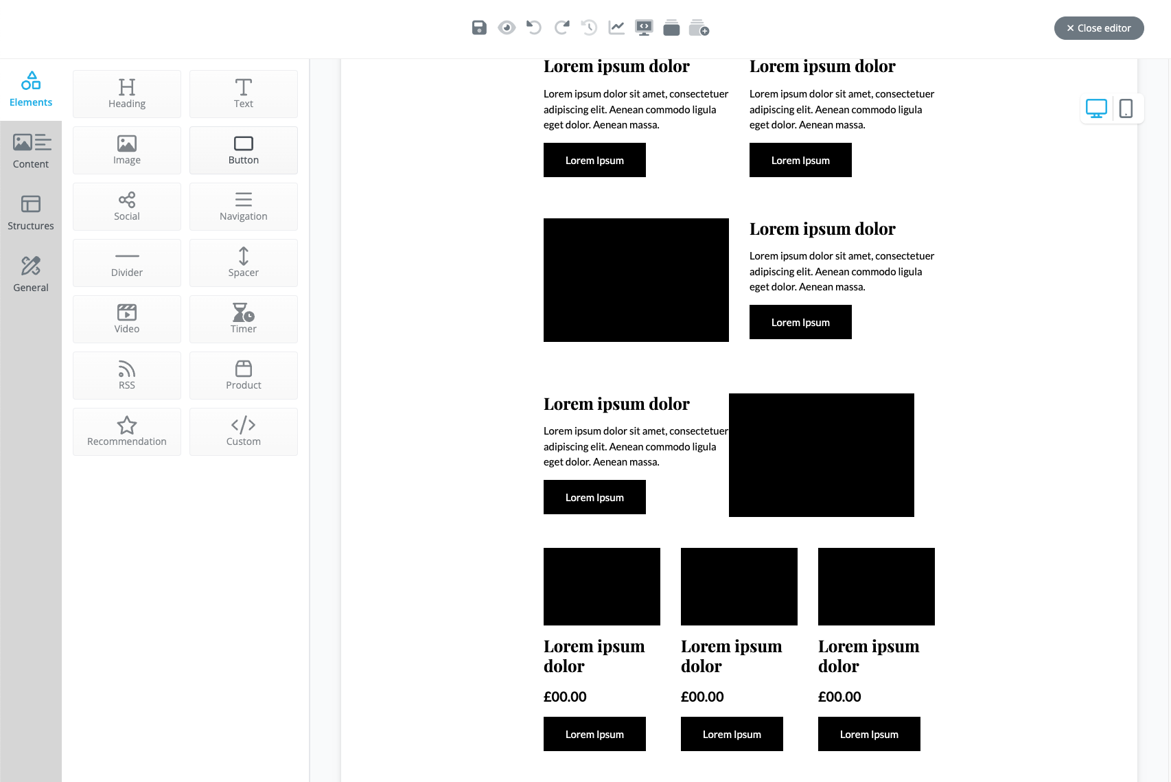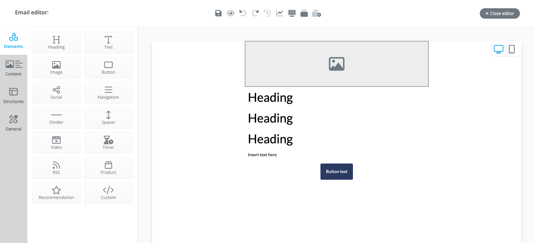 Next, start placing content elements you're going to need in your email template such as images, headings, paragraphs, and buttons. This of course will vary depending on exactly what you need in your template but these elements are the most common ones.