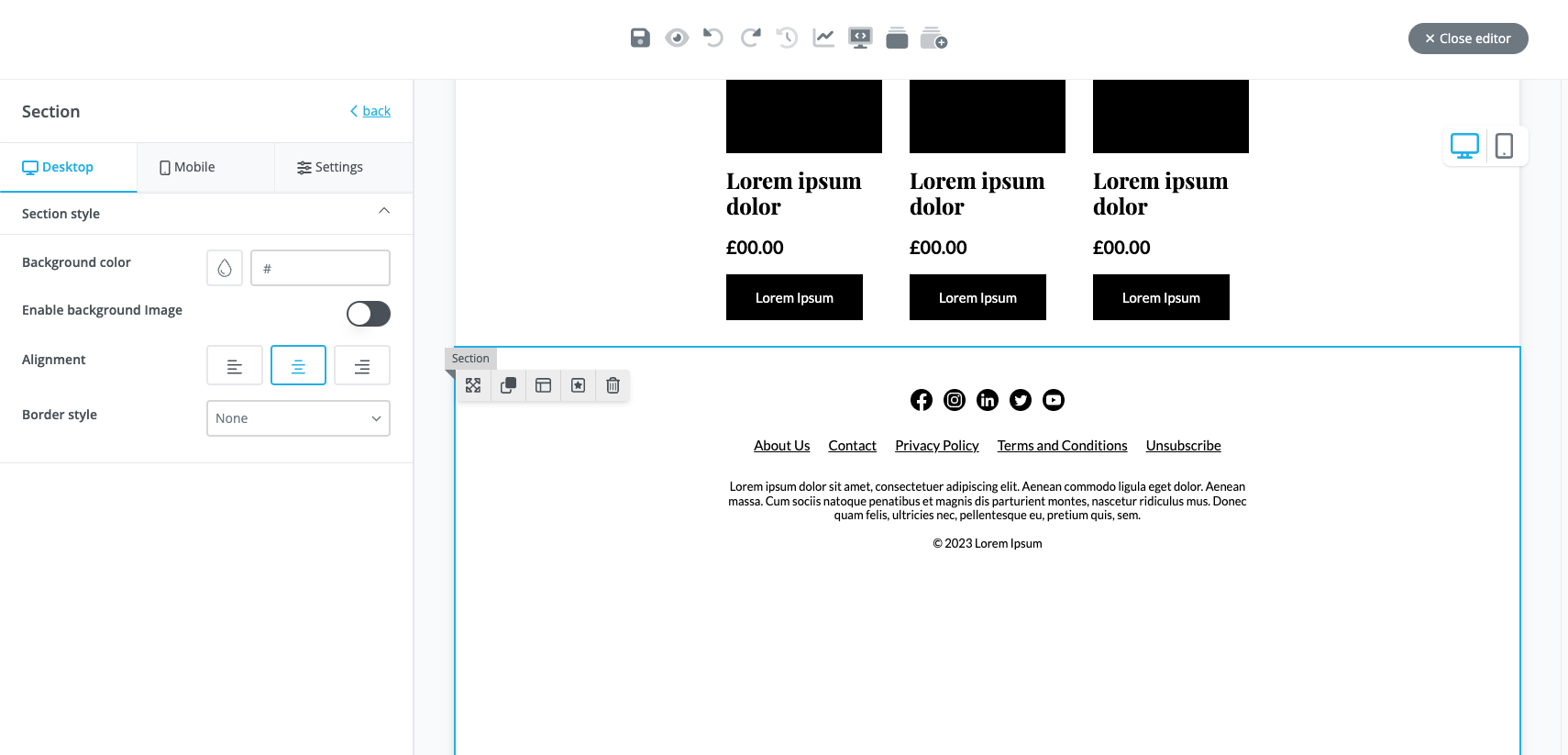 This footer contains links to different social media platforms for your audience to connect to, an array of useful links like the 'unsubscribe' link which is mandatory to any email (unless sent internally or is a legal requirement such as notices), text for conditions, and company information.