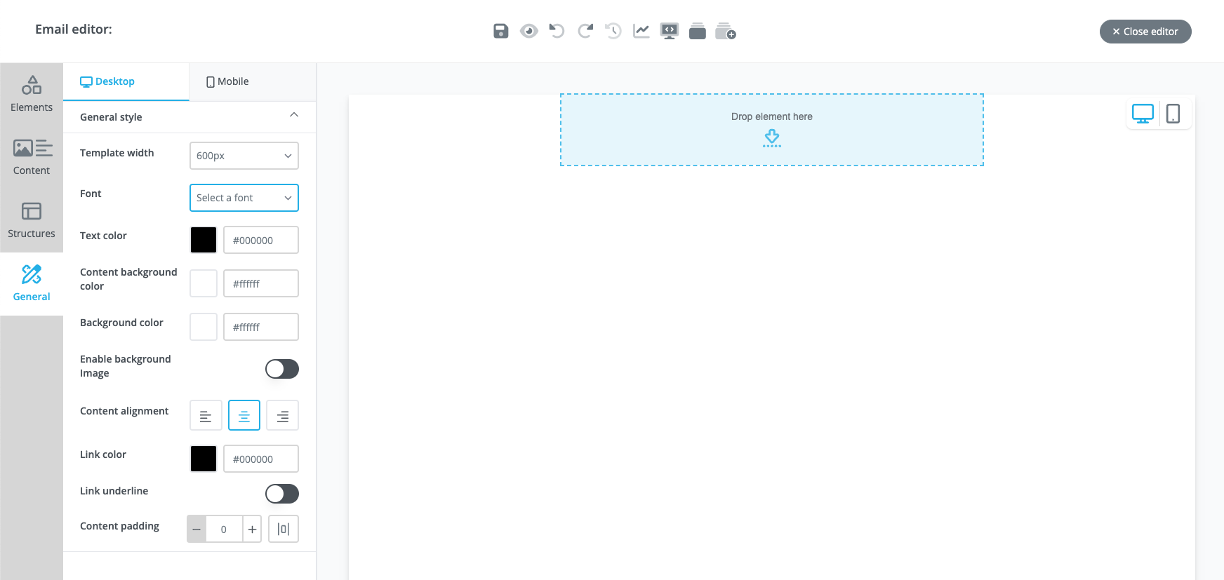 2023-07-12It's always a good idea to first begin your project by going to the 'General' tab found on the left panel. This will give you the option to set the general styles of your template like the email's width, background and text colours, etc.