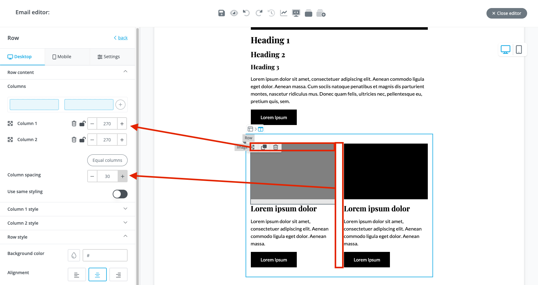 Now, duplicate the content from the left column and transfer them to right column. You also don't need all 3 headings at this point so leave just 1 and add some placeholder text. You should end up with something similar to the screenshot below. Note that you can edit the width of each column including the space between those columns by changing the 'Column spacing' value.